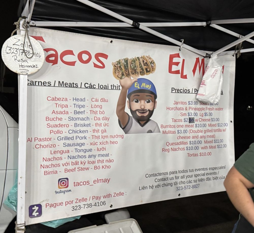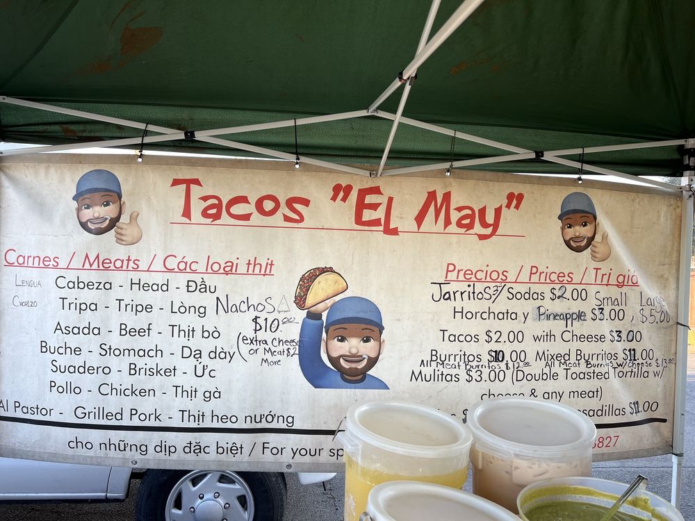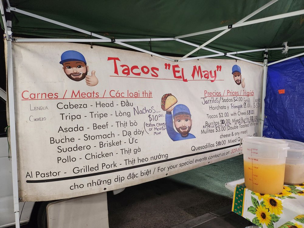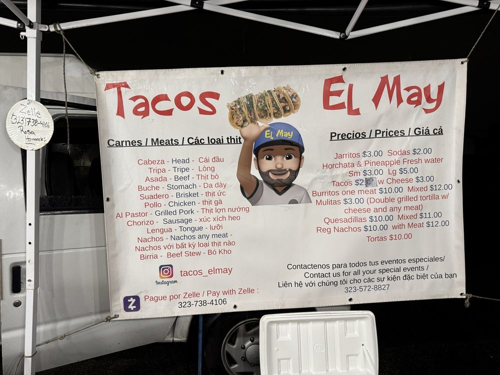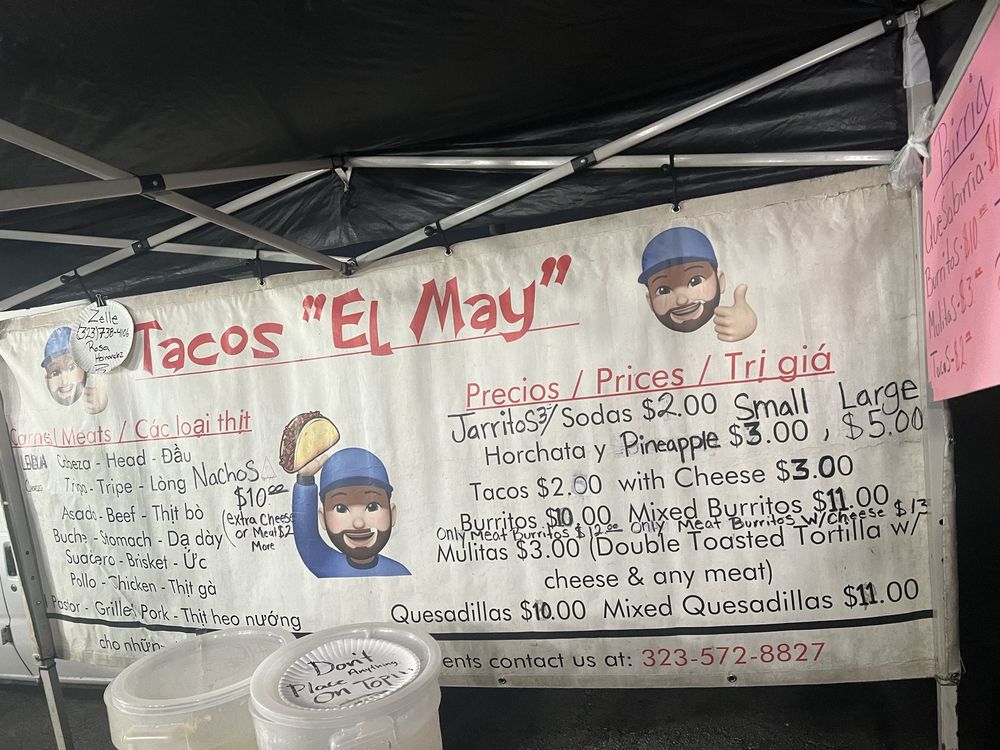 Located at 15002 Neece St, Westminster, CA, Tacos El May is a hidden gem that promises authentic street tacos without breaking the bank. Open from 6:30 PM to 11 PM, Tuesday through Sunday, this taco stand is beloved for its vibrant atmosphere and quick turnaround even during peak hours. Each taco is just $2, featuring a variety of meats like asada, al pastor, and tripas.
